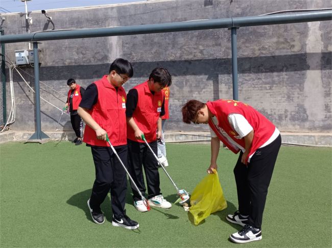 清风如约至,校园展新颜。在活动现场,志愿者用笤帚和夹子,细致地清理着地面上的杂物,捡拾草坪上的废弃物,志愿者们热情高涨,分工明确,认真地投入到各个区域的清扫工作中,用自己的双手让校园环境焕然一新。