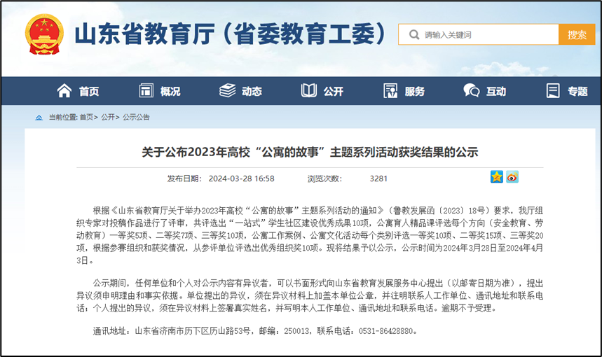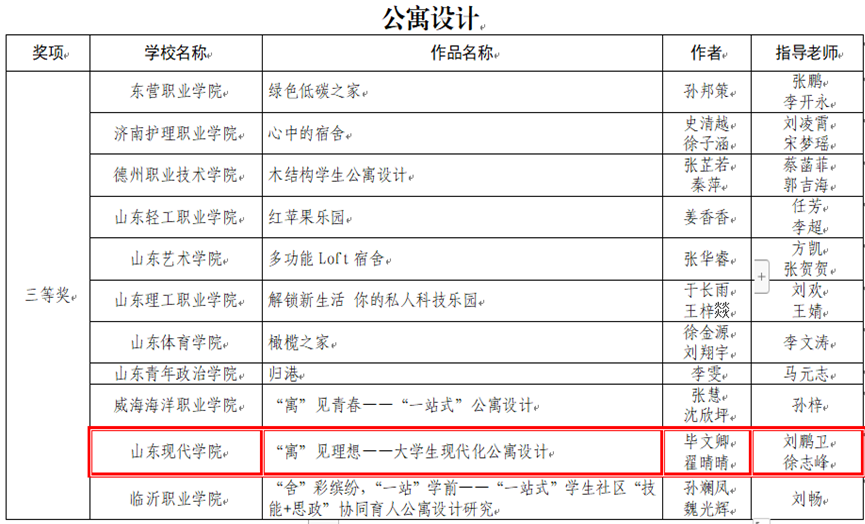 近日,山东省教育厅发布了《关于公布2023年高校“公寓的故事”主题系列活动评选结果的公示》,我校在此次评比活动中喜获佳绩:护理学院刘鹏卫院长和学生处徐志峰副处长指导,学生毕文卿和翟晴晴的参赛作品《“寓”见理想——大学生现代化公寓设计》在公寓设计类中荣获三等奖。
