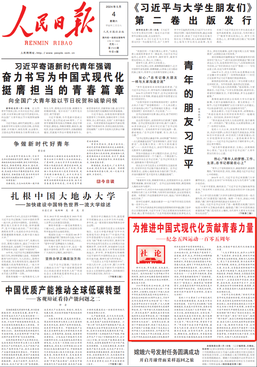 神州大地,草木葳蕤、生机盎然。今天是五四青年节,也是五四运动105周年纪念日。我们向全国广大青年致以节日的祝贺,缅怀五四先驱崇高的爱国情怀和革命精神,以更好地弘扬五四精神,激发复兴力量。