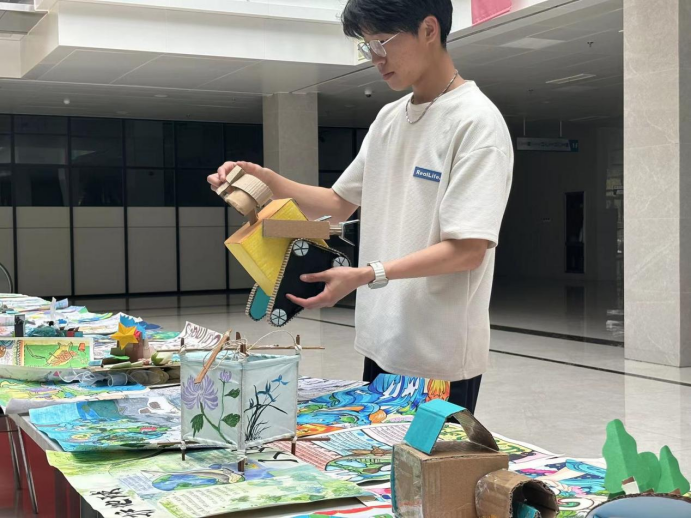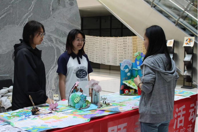 国风画、水墨画、素描等众多作品栩栩如生,不仅如此,学生们还充分发挥想象,废物利用,利用咖啡袋子做成了漂亮的荷花,用过的纸板做成了收集垃圾的纳米机器人,时刻提醒着同学们爱护环境、保护地球。