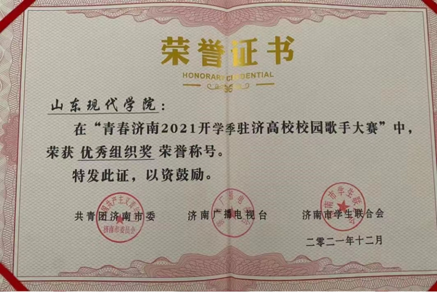 荣获2021年“青春济南2021开学季驻济高校校园歌手大赛”优秀组织奖