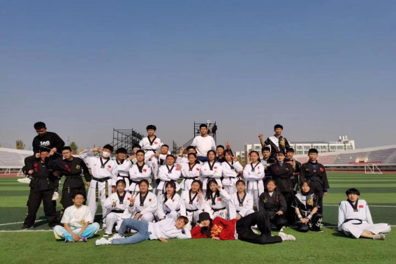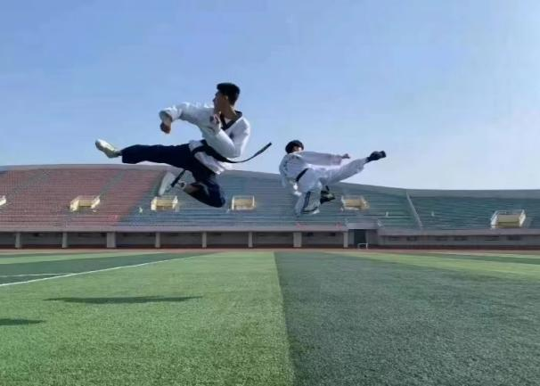 阳光下,社员们身着道服,扎紧腰带,后腿往后一撤,双手在身前,呈实战姿势,尽显青春风采,展现出跆拳道精神以及跆拳道的激情热血。社员们腾空而起,迅速旋转身体,调动腿部力量狠狠踢出,进攻如行云流水,连绵不绝,力度、速度、灵活性并存。