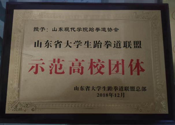 2018年12月,山东现代学院跆拳道协会被山东省大学生跆拳道联盟总部授予“示范高校团体”称号;
