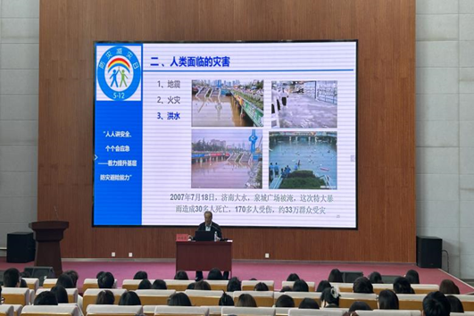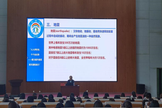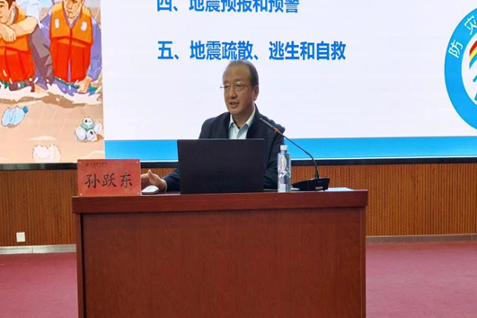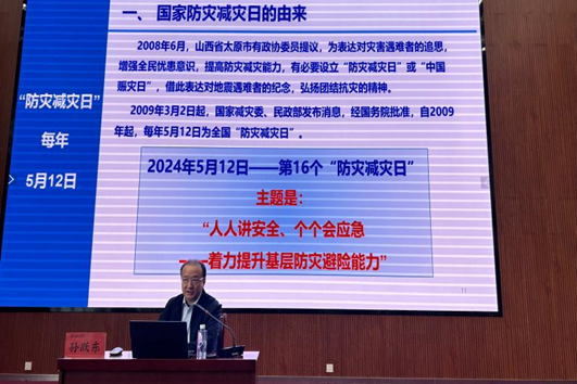 在讲座中,孙跃东教授向大家介绍了今年国家防灾减灾日的主题——“人人讲安全,个个会应急——着力提升基层防灾避险能力”,并以汶川8.0级大地震为例,向同学们介绍了国家防灾减灾日的由来,以及我国设立“国家防灾减灾日”的原因。