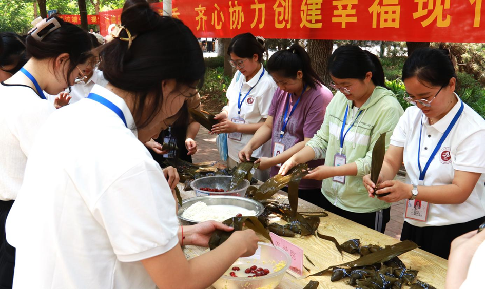 活动现场,悬挂的节日横幅营造了浓厚的节日氛围,桌子上摆放多样的食材激发了大家包粽子的兴趣,师生以芳香的祝愿为叶,以宽厚的包涵当米,以温顺的吩咐做馅,再用友情的丝线缠绕,做出的粽子样式精致,用料十足。