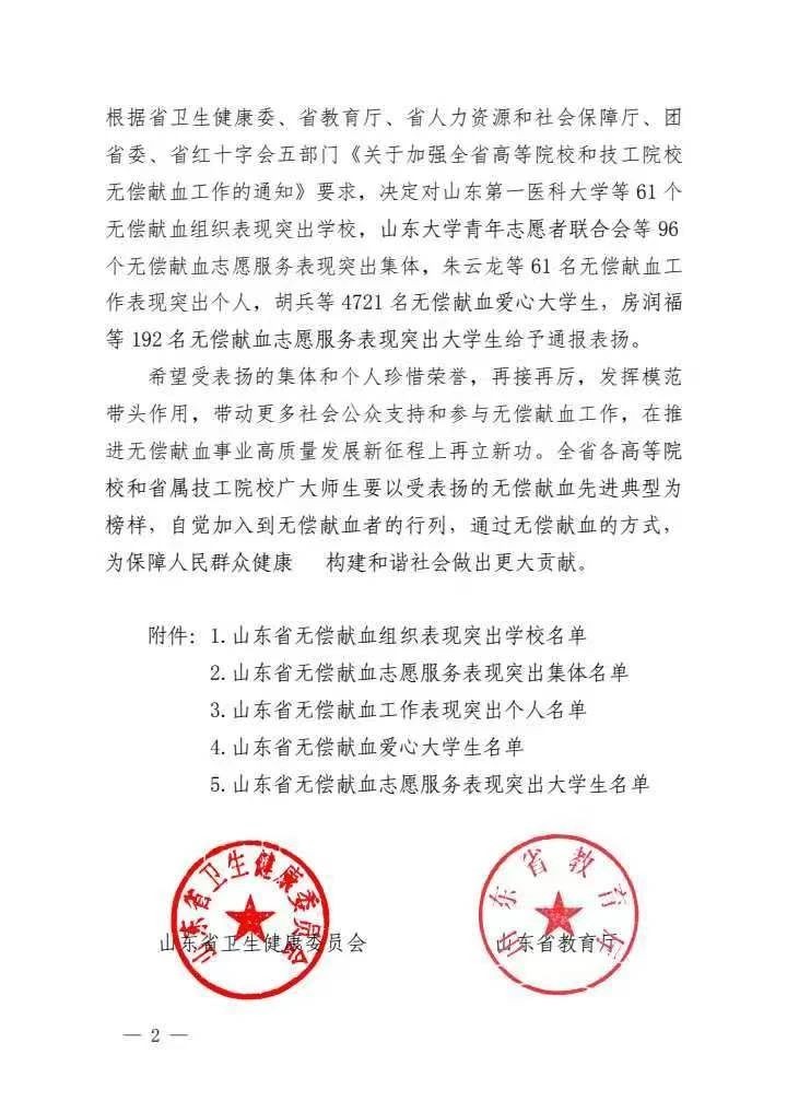 近日,山东省卫生健康委员会、山东省教育厅、山东省人力资源和社会保障厅、共青团山东省委、山东省红十字会等单位联合下发《关于表扬2023年度山东省高校无偿献血表现突出集体及个人的通报》,我校荣获多项荣誉表彰。