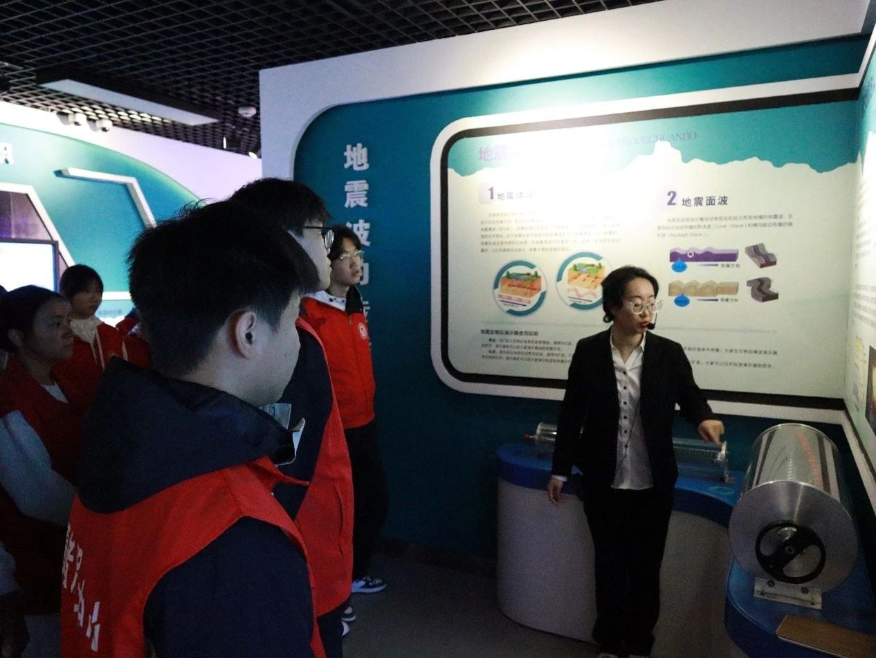 讲解员首先利用馆内的全息投影详细地介绍了我国地震的多发特征及灾害情况,同学们跟随着讲解员的脚步,漫步于展厅,系统性地认识了地震的基本常识、地震的分级和地震波的传播。