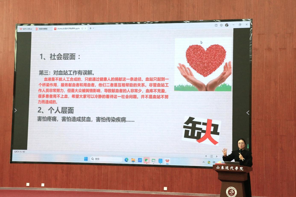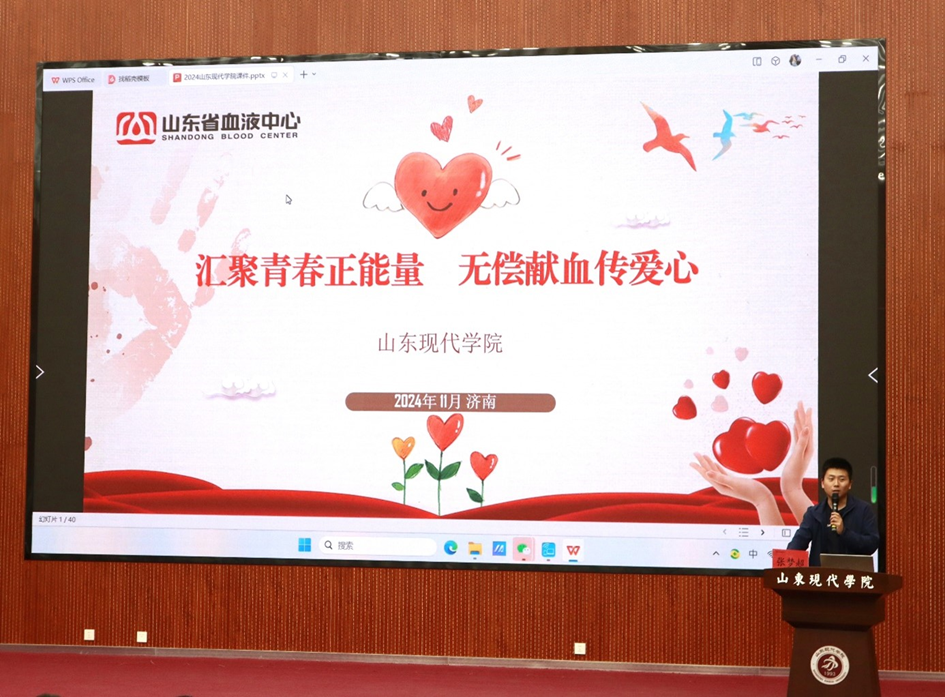 血液储备是医疗保障的关键,无偿献血体现的是社会凝聚力与互助精神。为加强校园精神文明建设,增强学生的责任意识,提高无偿献血的参与度,11月13日—14日,由共青团山东现代学院委员会主办、志愿者服务中心红十字协会承办的“汇聚青春正能量·无偿献血传爱心”无偿献血宣传讲座在图书馆报告厅举办。