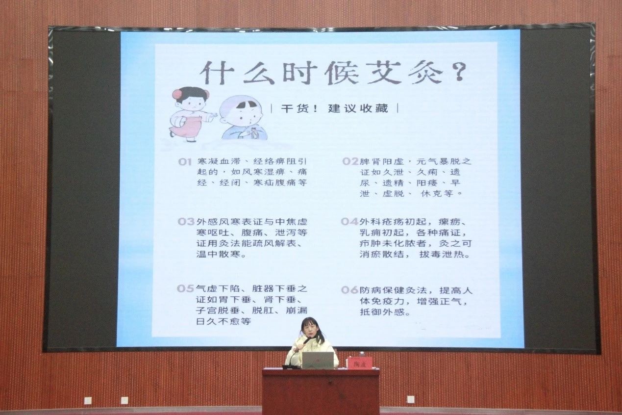 针通经络,灸调阴阳。陶波老师以“艾”字为引,详细讲解了艾灸的悠长历史和现代意义,她提到,艾灸早在商代就已得到普遍应用,其现代应用也非常广泛,不仅用于治疗各种疾病,还用于养生保健,扶阳除阴,她鼓励同学们以艾灸的方式调理自身。