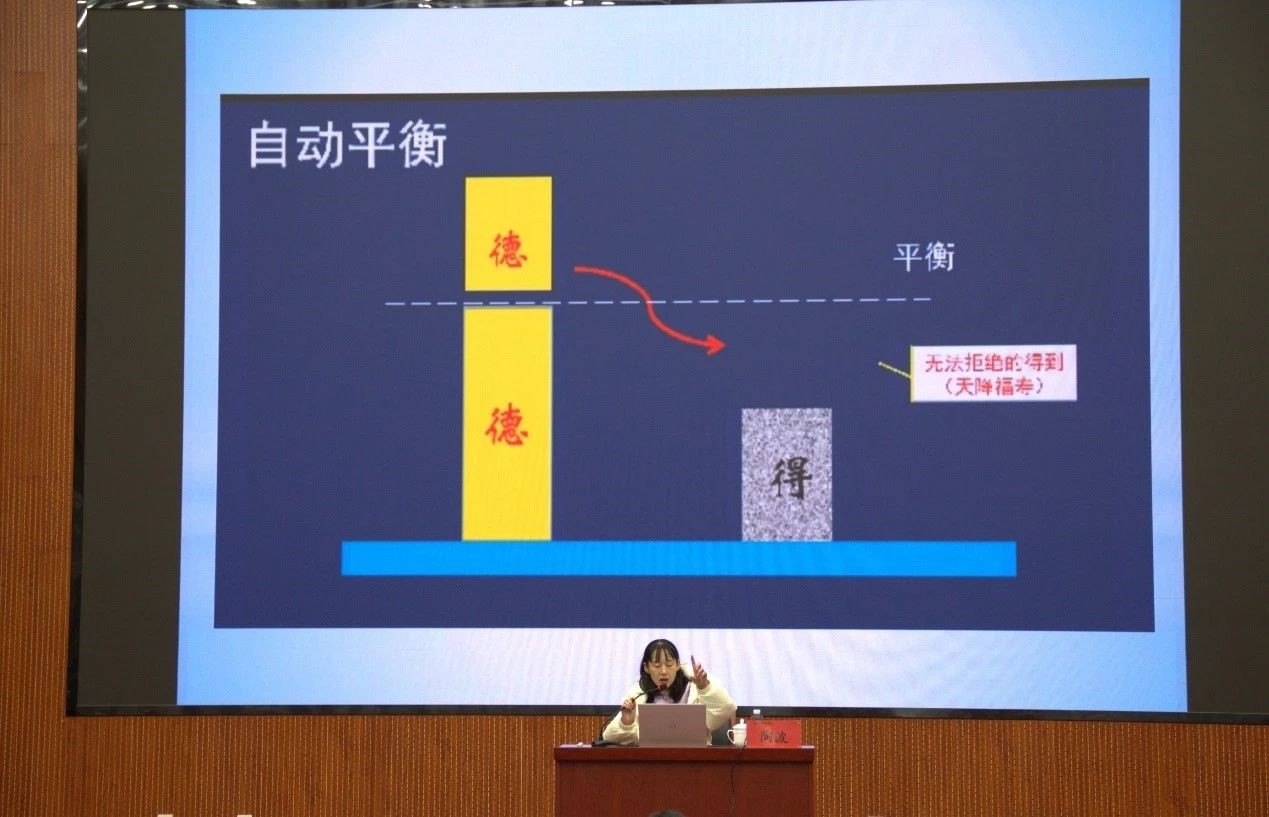 陶波老师围绕能量守恒定律向同学们讲解了真正想要弄懂财富要做到以下两点:“一是要知道它有两个部分,内在和外在,精神和物质,阴和阳。从物理学上来说,就是能量和物质;二是要明白财富的转化规律,财富可以从物质转化成能量,也可以从能量转化成物质。”她希望同学们能够始终保持祥和、喜悦、充满爱的心境,努力提升自己的平均能力层级。