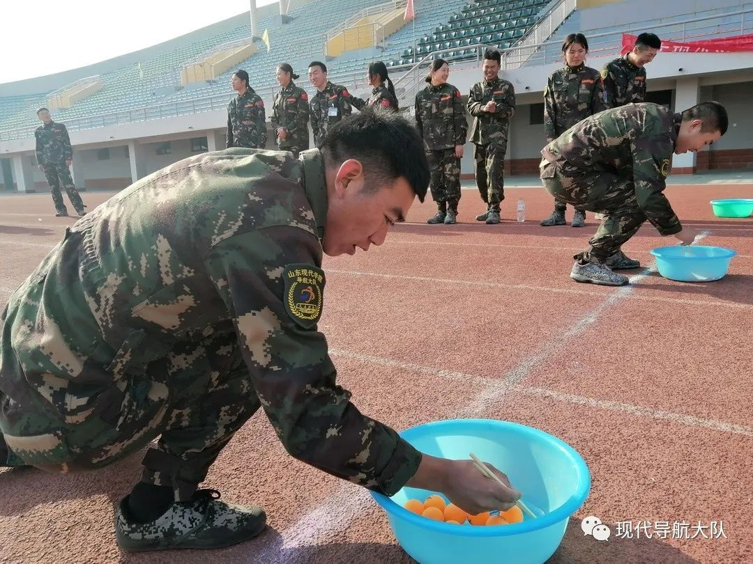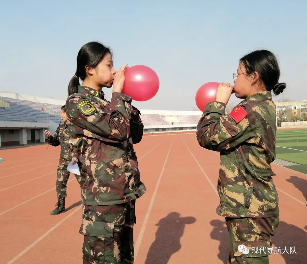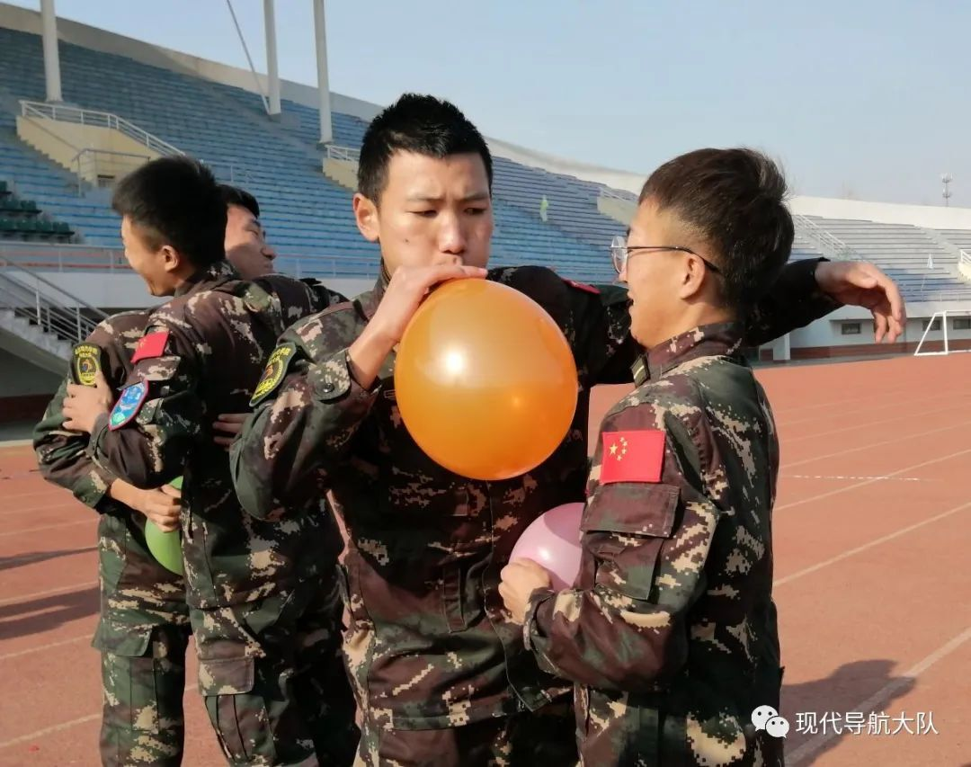 两面夹击项目紧随其后,两名队员原地同时进行口吹气球,放置腹部,夹爆一次为成功一次。一声哨响,导航员们奋尽全力吹气,夹爆气球。