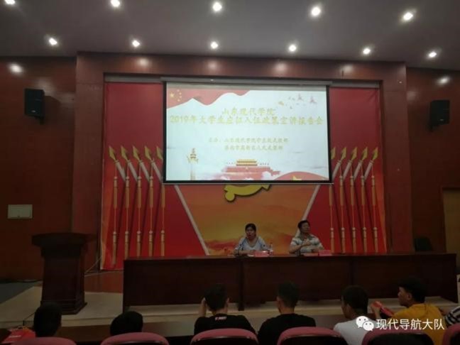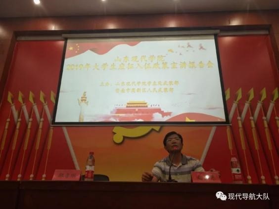 山东现代学院在2019年6月12日下午2点,于科研楼101召开了“2019年大学生应征入伍政策宣讲报告会”。会议由学生处处长邵鲁琳主持,济南市高新区人民武装部征兵办公室主任赵卫东主讲,本次宣讲主要从党和国家(政策和态度)、国防建设、鼓励参军这三个方面展开。