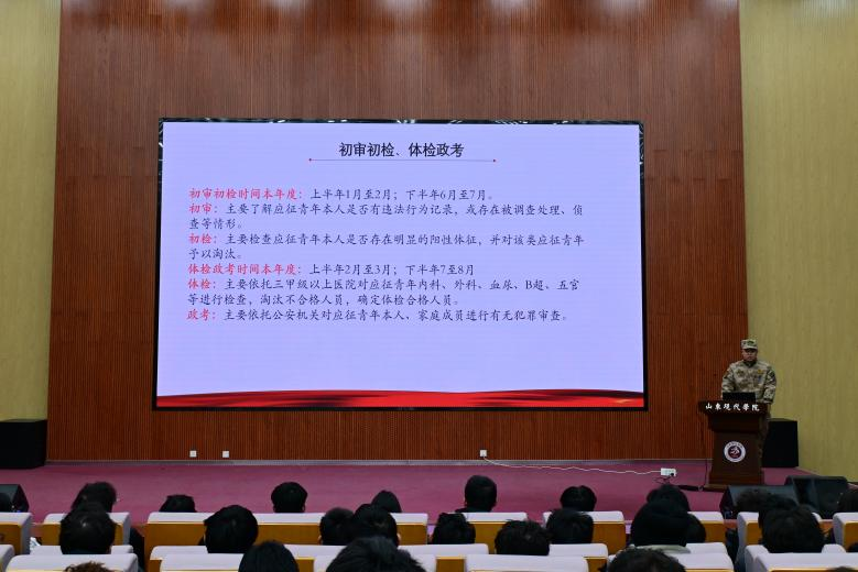 为深入学习贯彻习近平强军思想,积极响应号召,激发现代学子携笔从戎的报国情怀,近日,学校在图书馆报告厅开展2025年春季征兵政策宣讲会。本次宣讲会特别邀请济南高新区武装部军事科长李冰及征兵工作组相关参谋莅临指导。