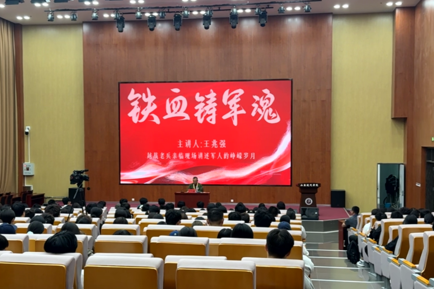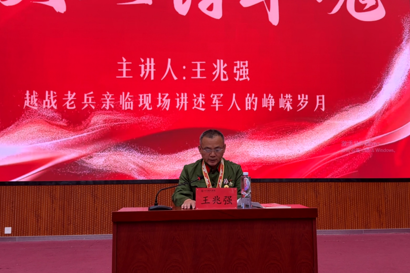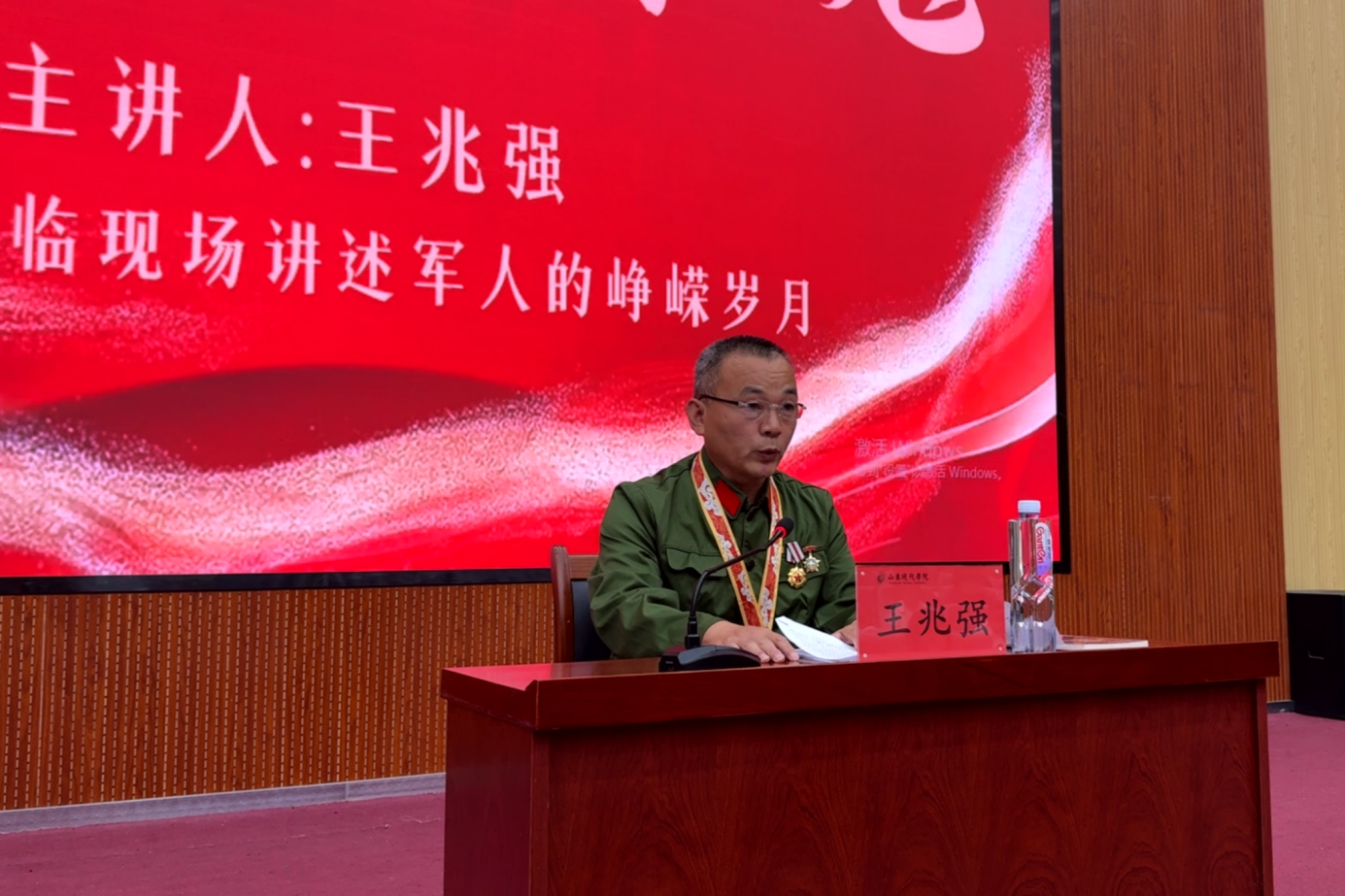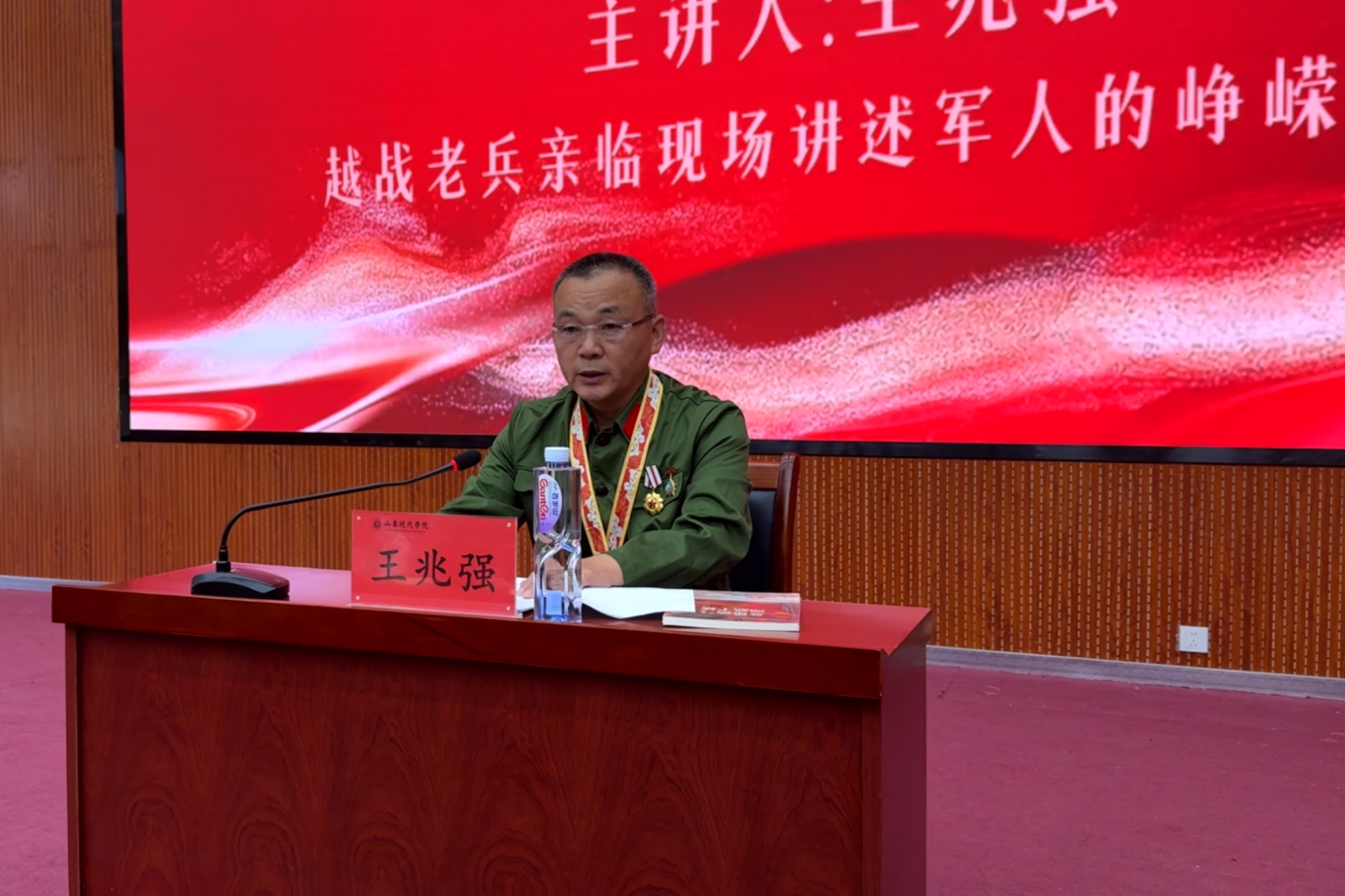 王兆强同志身着整洁旧军装,胸前佩戴多枚承载岁月印记的荣誉勋章,在师生热烈掌声中走上演讲台。他以沉稳深情的语调,结合自身从参军入伍到奔赴前线的经历,为现代师生带来一场生动而深刻的讲述。