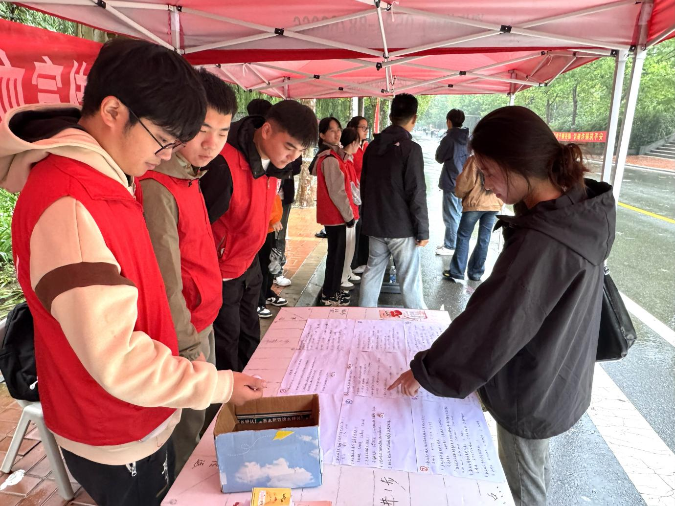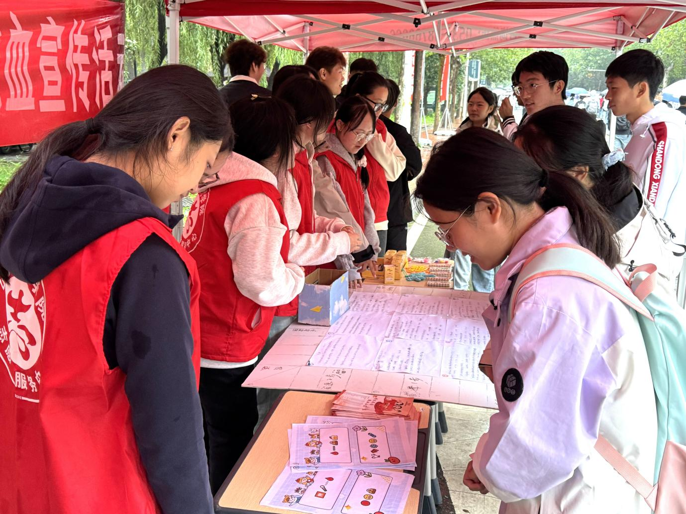活动开展前,志愿者们有序准备好物资,放置在指定区域,随时为参与学生提供服务。
