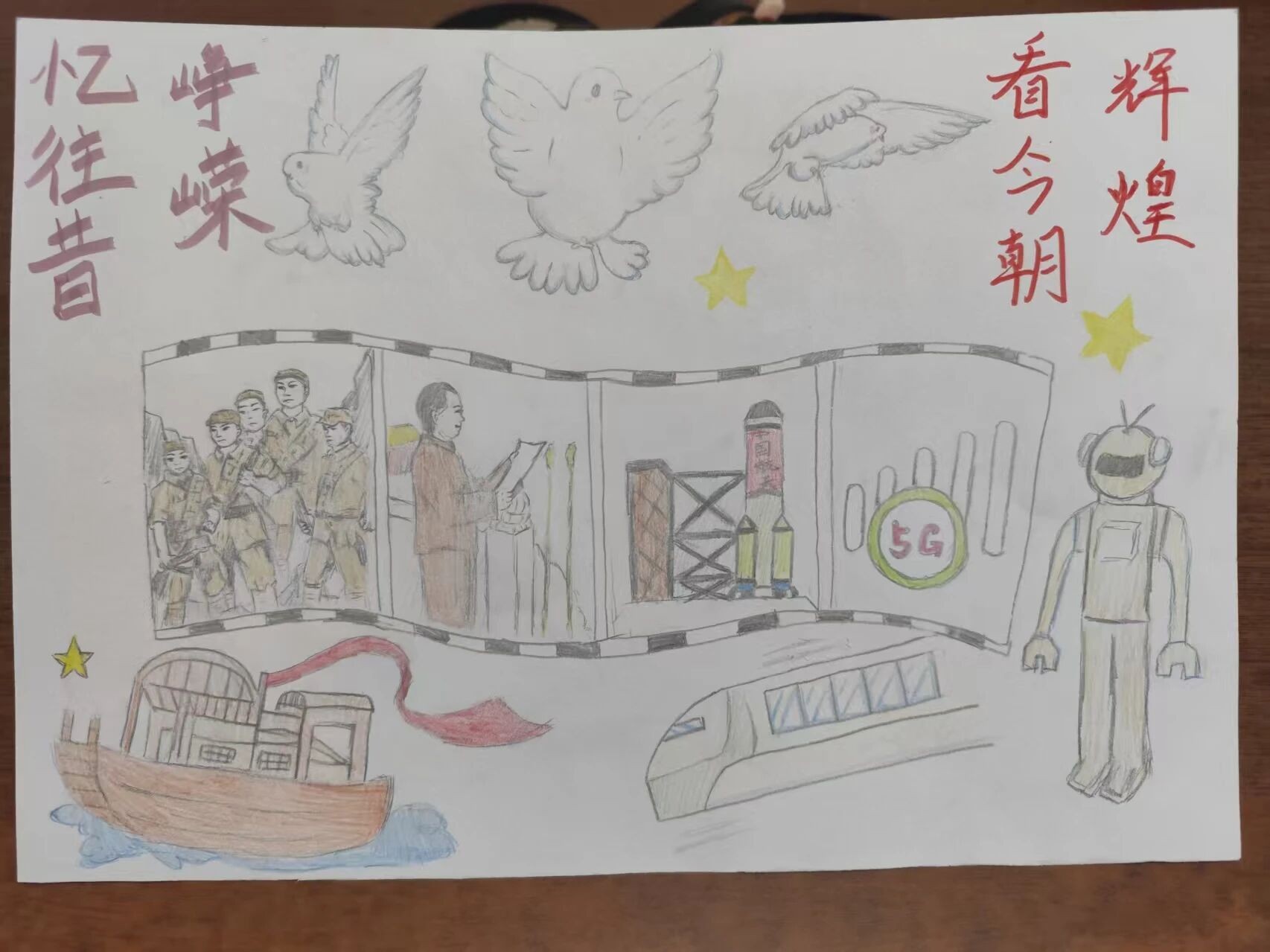 参赛选手将“忆往昔”的厚重与“今朝辉煌”的璀璨紧密相连,让不同时空的家国故事在此交织。“忆往昔”篇章里,革命先烈的挺拔身姿、长征路线的蜿蜒印记、开国大典的历史瞬间,皆在选手笔下鲜活起来;“星星之火,可以燎原”等铿锵语句点缀其间,仿佛将观众带回那段风雨兼程的岁月,清晰再现祖国从求索到奋起的艰难历程。