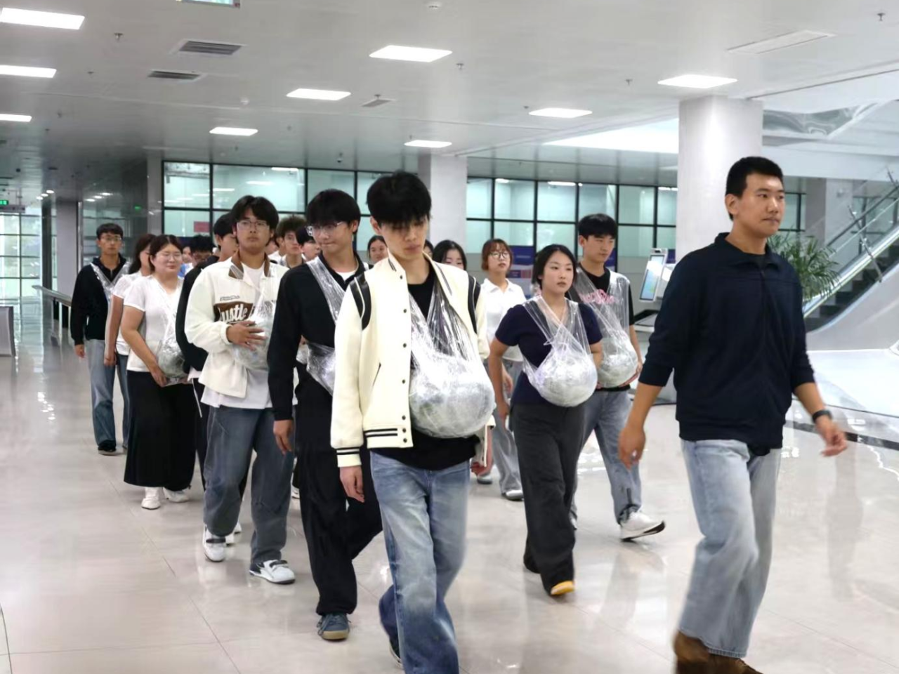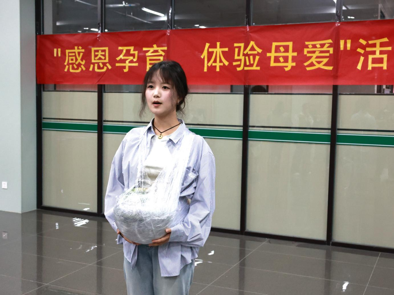 在工作人员指导下,同学们将重约10公斤的西瓜小心固定在腹部,通过保鲜膜与胶带的仔细缠绕,亲身体验孕生命的“特殊重量”。