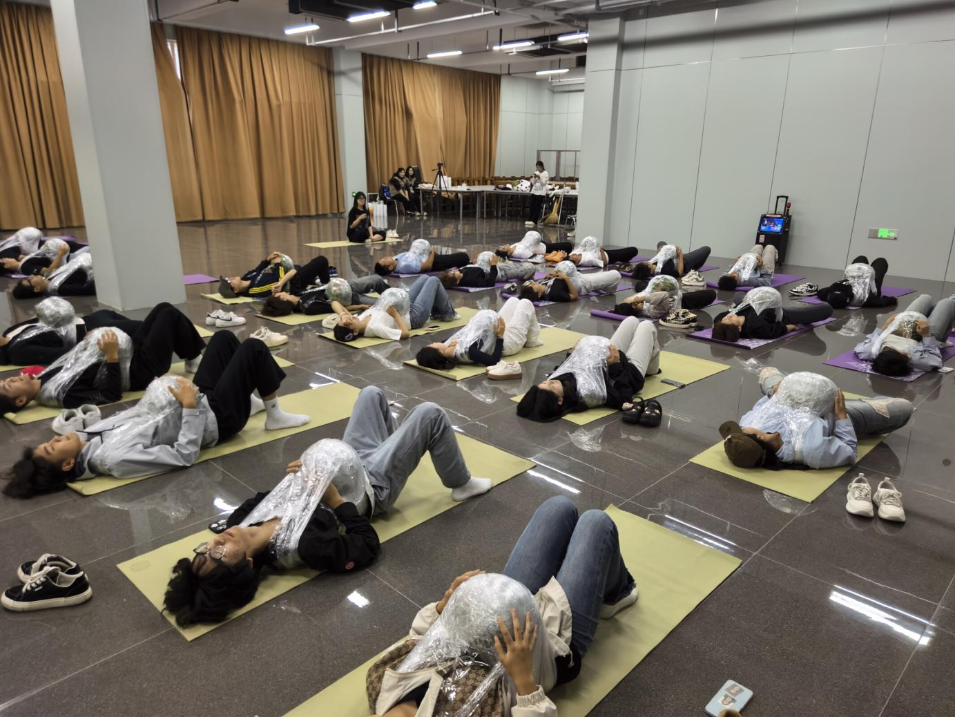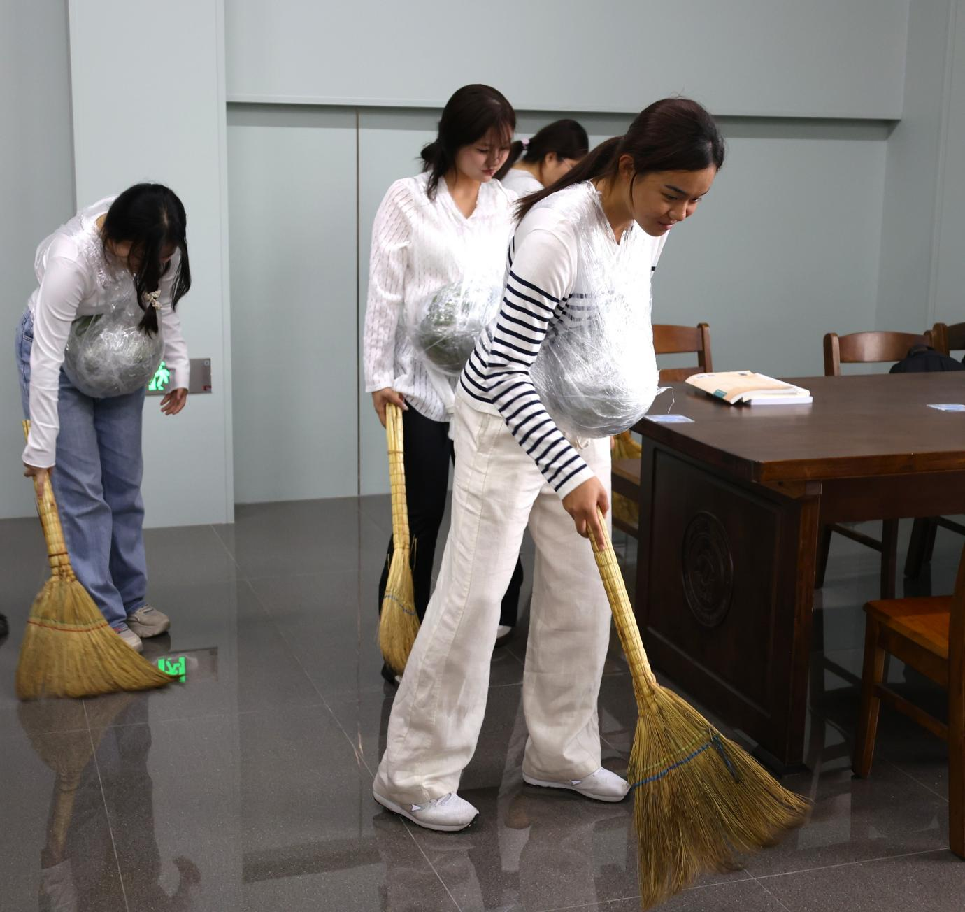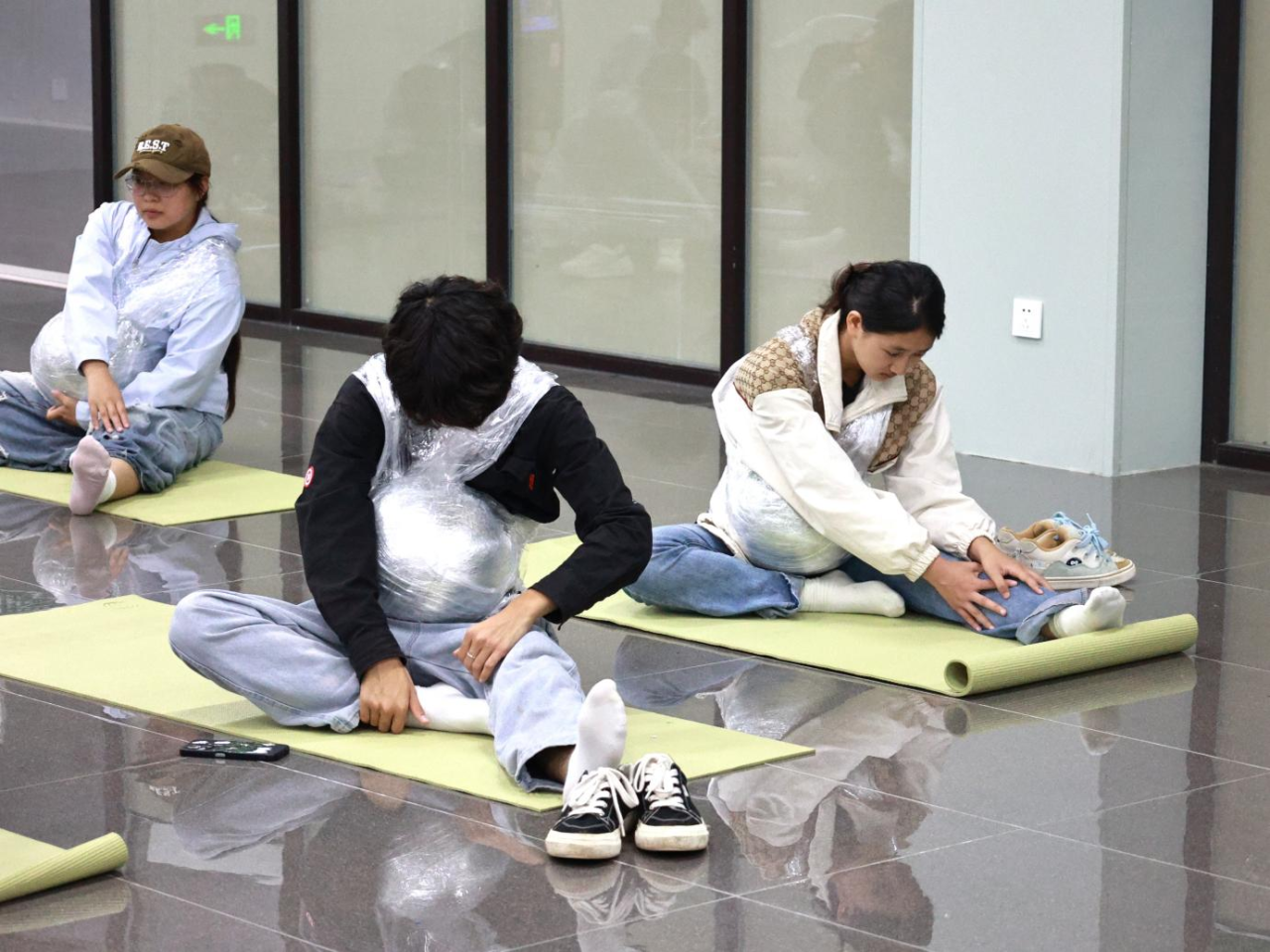 随后,学子们带着这份“特殊重量”,尝试完成扫地、弯腰拾物、上下楼梯等日常动作,并特别设置了平躺体验环节。大家尝试平躺、侧卧等多种姿势,却依然难以找到舒适安稳的睡姿,真切体会母亲孕期辗转反侧、夜不能寐的辛苦。最初的新奇渐渐被身体的酸胀与疲惫取代,每个动作都变得迟缓而吃力,让学生们深刻感受到母亲怀胎十月所付出的艰辛。