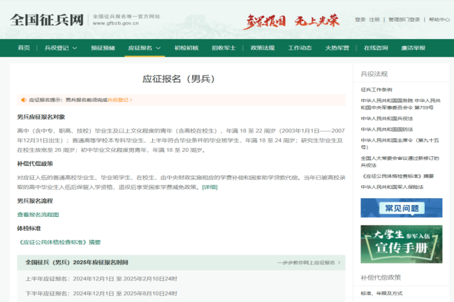 男兵:高中(含中专、职高、技校)毕业生及以上文化程度的青年(含高校在校生),年满 18 至 22 周岁(2004年1月1日——2008年12月31日出生);普通高等学校本专科毕业生、上半年符合毕业条件的毕业班学生,年满 18 至 24 周岁;研究生毕业生及在校生放宽至 26 周岁;初中毕业文化程度男青年,年满 18 至 20 周岁。