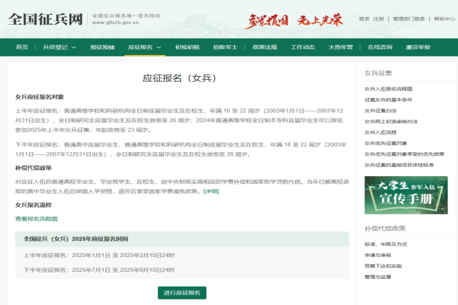 女兵:普通高中应届毕业生、普通高等学校和科研机构全日制应届毕业生及在校生,年满 18 至 22 周岁;全日制研究生应届毕业生及在校生放宽至 26 周岁;2025年普通高等学校全日制本专科应届毕业生可以报名参加2026年上半年女兵征集,年龄放宽至 23 周岁。
