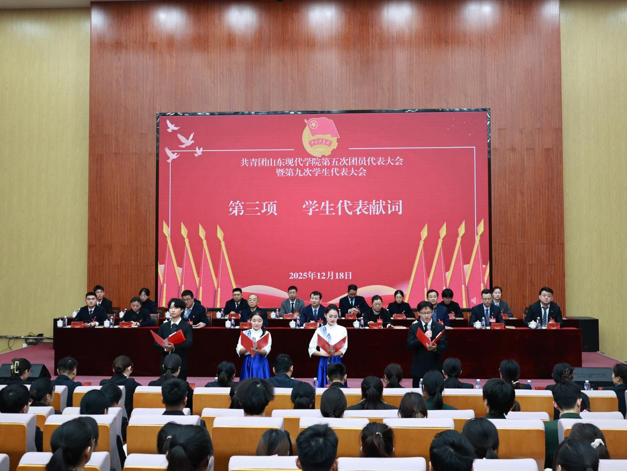 12月18日,我校在图书馆报告厅隆重召开共青团山东现代学院第五次团员代表大会暨第九次学生代表大会(以下简称“双代会”)。共青团济南市委分管负责同志、学校党委书记陈晓兰、执行校长朱松涛、常务副校长姜同松出席大会,统战部部长仲光强,校长助理房昌盛,学生处党支部书记刘锦绣,校长办公室主任王东升,各二级学院党总支书记,常务副院长及学管就业副院长与296名正式代表参加会议。